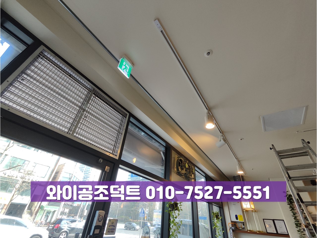 오늘은 안양시 동안구 호계동에 국내산 돼지고기를 취급하는 음식점에 시공을 다녀왔습니다. 신규 오픈 때 시공을 해드렸던 곳이었습니다. 홀에서 굽는 고기는 테이블 자리마다 설치되는 내부 공기 정화기 필터가 있다고 홀의 배기에 대해서는 전혀 신경 쓰지 말아달라고 하셨던 곳이었습니다. 한데 매장을 운영하면서 사용을 해보시니 불판에 내장된 공기 정화기로 인해 불이 약해지고, 기대했던 성능이 나오질 않는다고 의뢰를 주셨습니다. 홀의 천장을 이미 도배지로 마감지어 놓았기 때문에 천장을 이용하여 배기 시설을 확충하기가 어려운 상황이었습니다. 따라서 출입문의 상판 유리를 떼어내고 자연 급기 통로를 만들기로 하였으며, 홀의 급기 통로와 주방의 급기 흡입구에서 가장 먼 곳인 매장의 전면 가운데 유리를 떼어내고 고압환기팬 2대를 설치하여 홀의 배기를 하기로 상의하였습니다. 환기팬의 스위치는 2대를 별도로 켤 수 있도록 요청하셔서 2구 스위치를 달아드렸습니다.